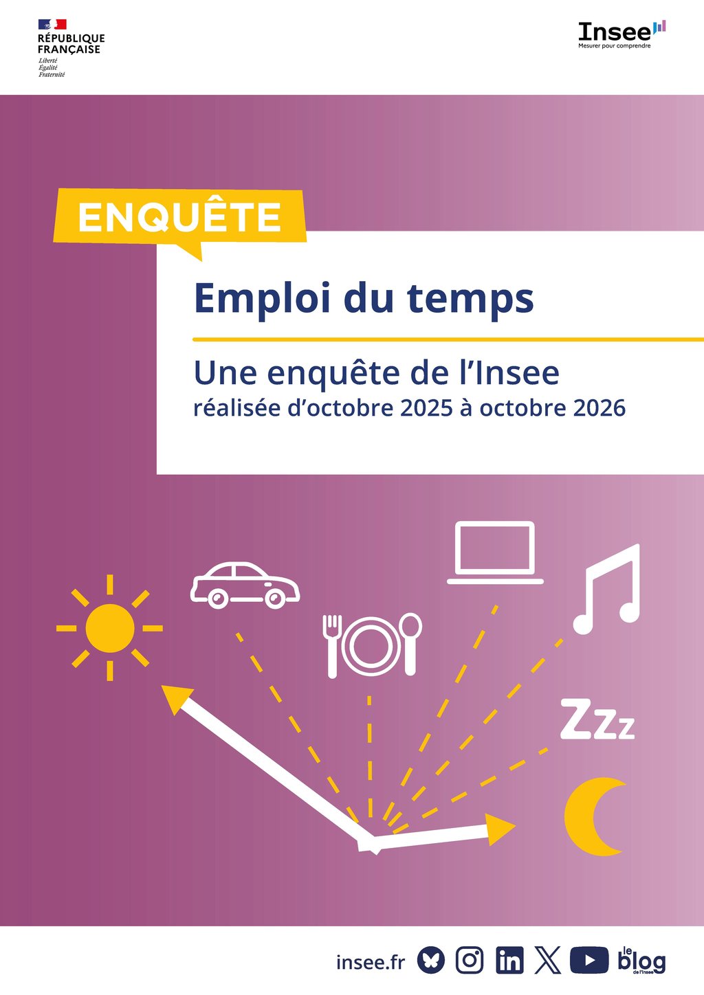 L'Institut national de la statistique et des études économiques (Insee) réalise au cours des années 2025 et 2026 une enquête sur le thème de l'emploi du temps.