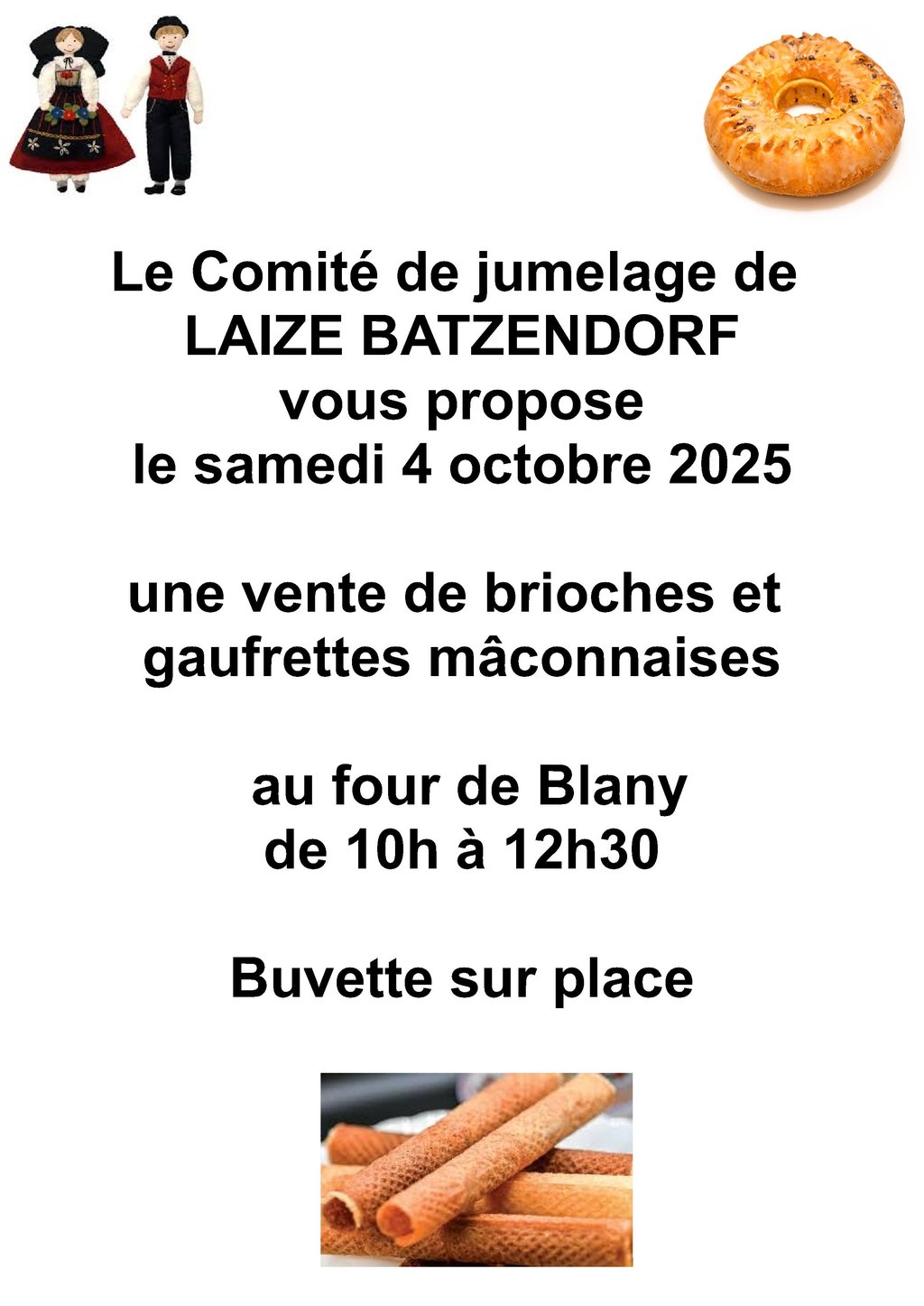 Le comité de jumelage de Laizé - Batzendorf vous propose une vente de brioches et gaufrettes mâconnaises