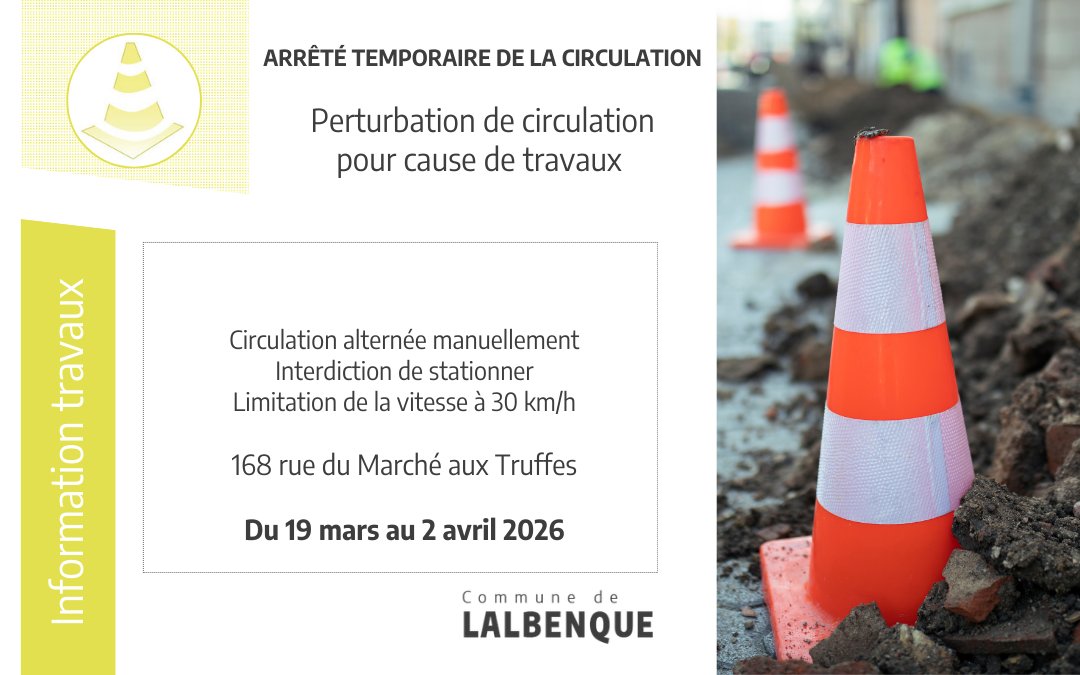 Arrêté de circulation du 19/03/2026 au 02/04/2026 au 168 rue du Marché aux Truffes.