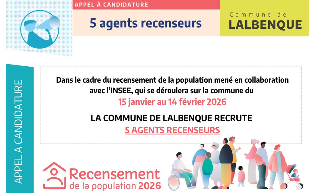 Dans le cadre du recensement de la population mené en collaboration avec l’INSEE, qui se déroulera sur la commune du 15 janvier au 14 février 2026, la commune de Lalbenque recrute 5 agents recenseurs.