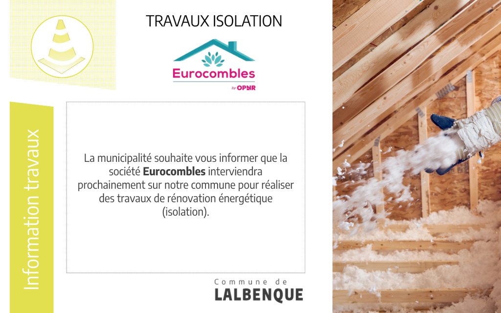 La municipalité souhaite vous informer que la société Eurocombles interviendra prochainement sur notre commune pour réaliser des travaux de rénovation énergétique (isolation).