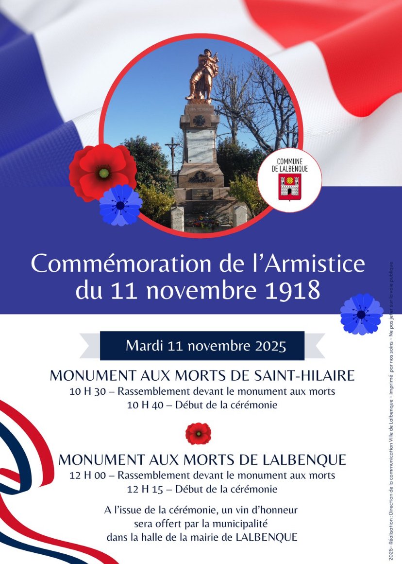 Nous vous convions à la cérémonie commémorative du 11 novembre qui se déroulera :A l’issue de la cérémonie, un vin d’honneur sera offert par la municipalité dans la halle de la mairie de LALBENQUE