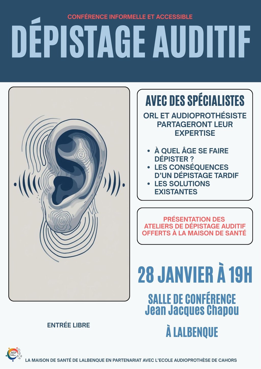 La maison de santé de Lalbenque a le plaisir de vous inviter à une conférence sur le dépistage auditif, à la Salle Jean-Jacques Chapou à Lalbenque (Communauté des Communes de Lalbenque-Limogne).
