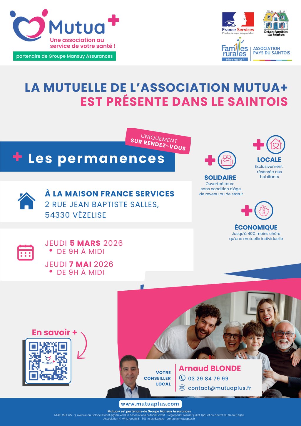 - Permanences Mutua + : jeudi 5 mars et jeudi 7 mai 2026.