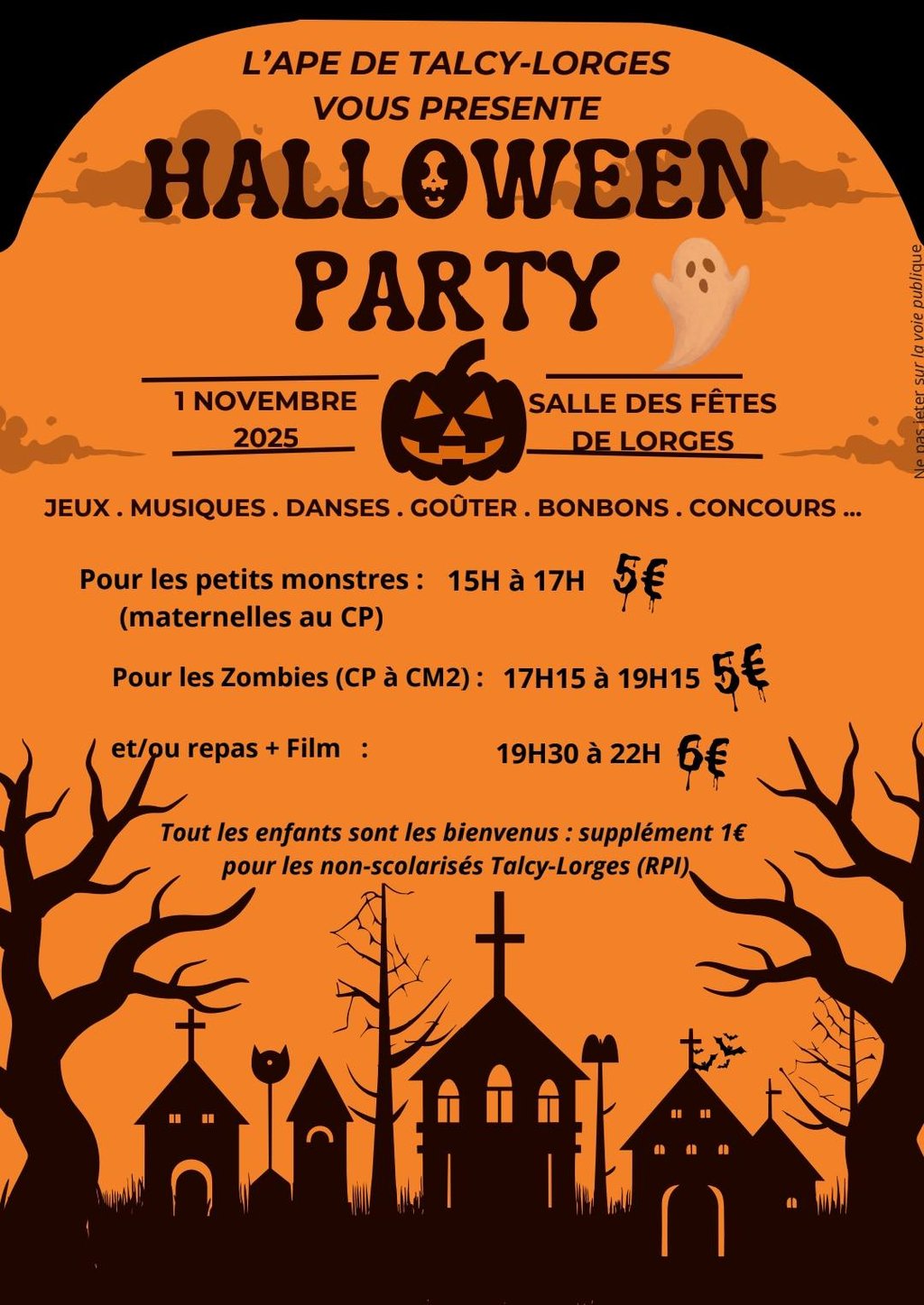 L'équipe monstrueuse et terrifiante de l'APE est heureuse de vous retrouver pour fêter Halloween avec vous le Samedi 1er novembre à la salle des fêtes de Lorges.