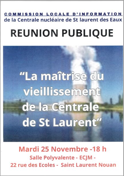 La Commision locale d'information organise une réunion publique sur le thème :"La maîtrise du vieillissement de la centrale nucléaire de Saint-Laurent." à Saint Laurent Nouan, le mardi 25 novembre à 18 h à la salle polyvalente.