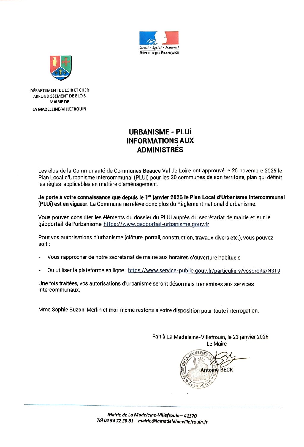 Merci de prendre connaissance du courrier, suite à l'adoption par la CCBVL de son PLUi.