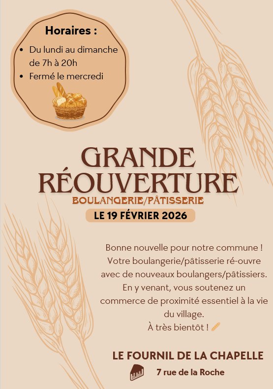 La réouverture d'un commerce est forcément une excellente nouvelle. La boulangerie/pâtisserie de nos voisins de La Chapelle rouvre avec de nouveaux boulangers/pâtissiers venant de Normandie le 19 février.