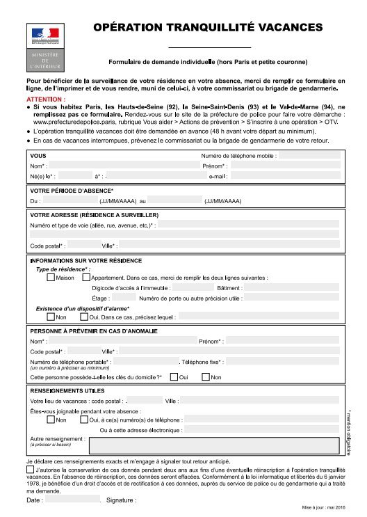Lors de vos absences, signaler le soit en vous connectant sur servicepublic.fr (https://www.service-public.gouv.fr/particuliers/vosdroits/R43241) ou en téléchargent le document papier, également disponible dans votre mairie ou dans toutes les gendarmeries.
