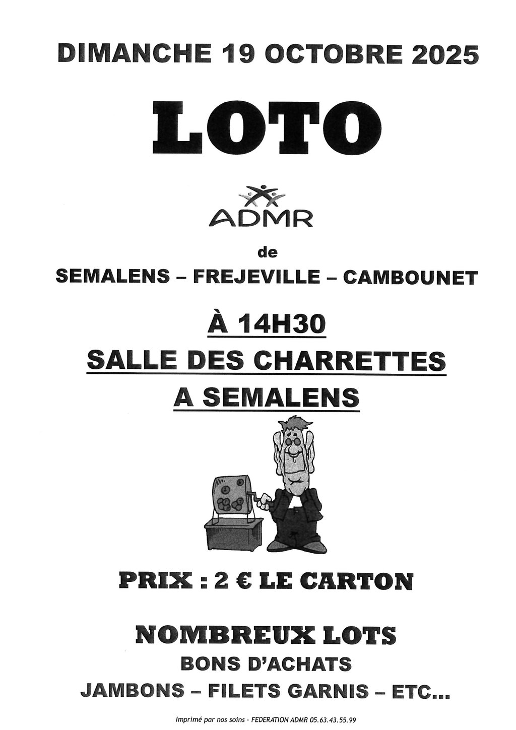 L'association ADMR de Sémalens organise son loto annuel le Dimanche 19 octobre 2025 à 14h30 à la salle des Charettes à Sémalens.