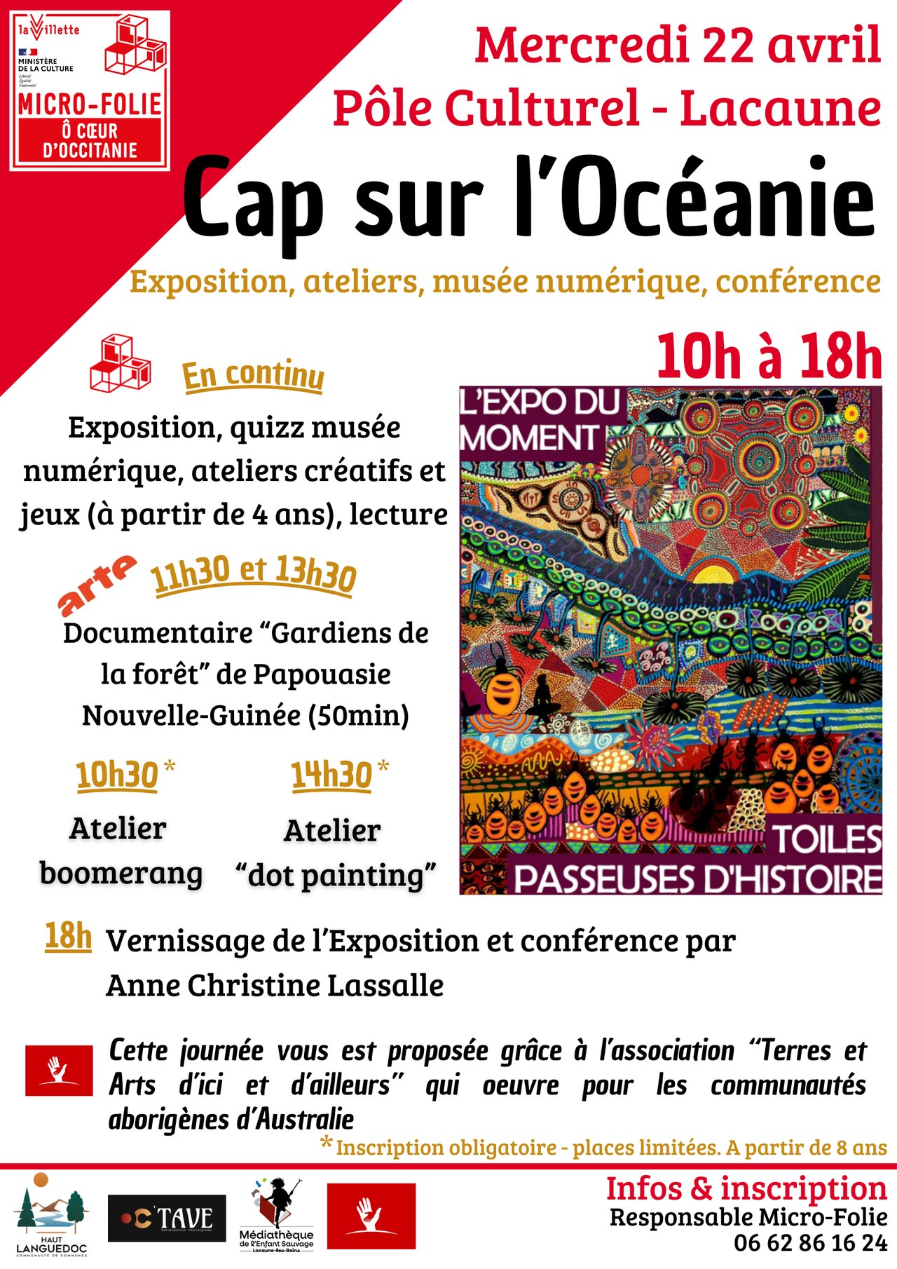 18h : Anne-Christine Lassalle, prรฉsidente de lโAssociation Terre et Arts dโIci et dโailleurs prรฉsentera lโexposition lors du vernissage, puis proposera une confรฉrence sur les arts premiers des aborigรจnes dโAustralie ainsi que son parcours auprรจs de ces communautรฉs. Verre de l'amitiรฉ offert