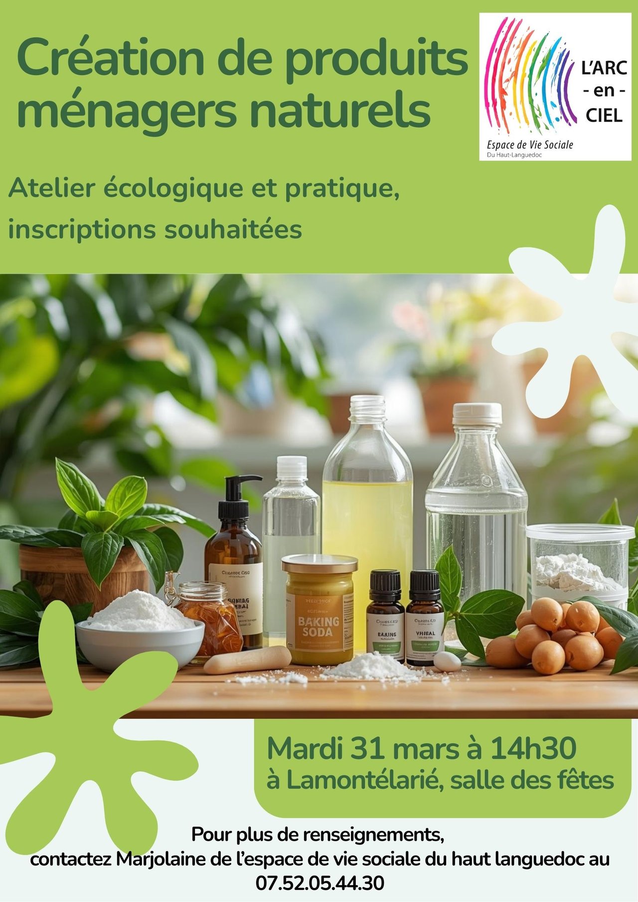 L'Espace de Vie Sociale Intercommunal l'Arc-en-Ciel propose un atelier de fabrication de produits ménagers naturels demain à Lamontélarié.