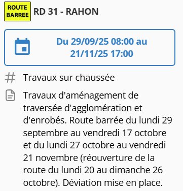 Pour votre information, la route sera coupée à Rahon du 29/09/25 au 21/11/25.