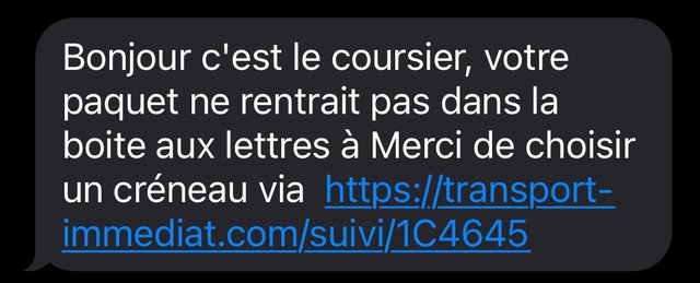 🚹 Un faux message circule actuellement, prĂ©tendant venir d’un livreur ou coursier indiquant que votre colis ne rentrait pas dans la boĂźte aux lettres, avec un lien du type :