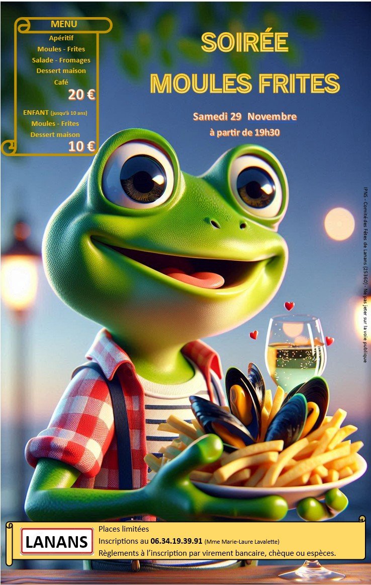 Soirée Repas Moules-Frites, le samedi 29 Novembre à partir de 19h30, à la salle d'animation de Lanans.