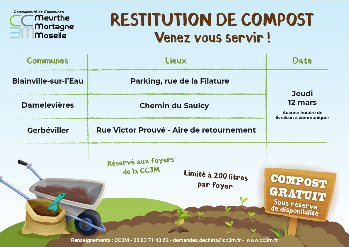 Chaque année, les déchets verts récoltés au sein des différentes déchetteries du territoire sont transformés en compost et une partie est mise à la disposition des habitants de la CC3M (dans la limite de 200 litres par foyer).