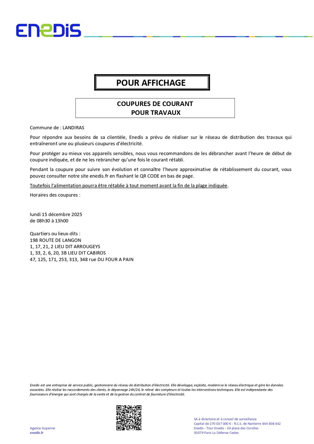 COUPURE DE COURANT POUR TRAVAUX LE LUNDI 15 DÉCEMBRE 2025