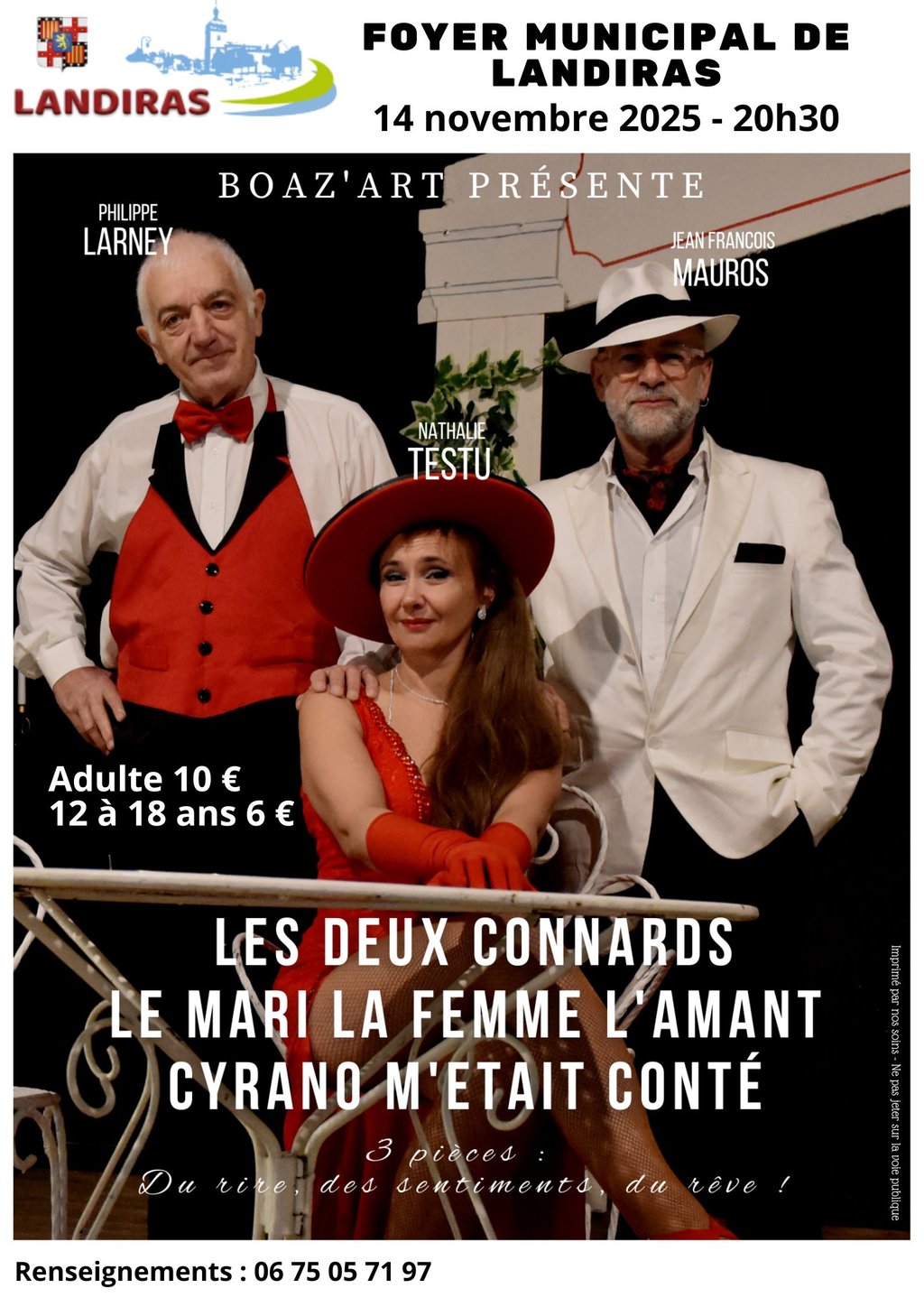 Le vendredi 14 Novembre 2025 au Foyer Municipal à 20h30 seront présentées 3 pièces : “Les deux connards”, “Le mari, la femme, l’amant”, et “Cyrano m’était conté”, écrites et mises en scène par le réalisateur Roland Alibert.