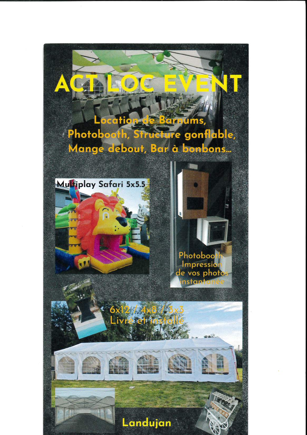 Location de Barnums, Photobooth, Structure gonflable, Mange debout, Bar à bonbons...
