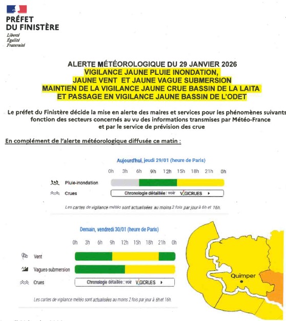 pluie-inondation et crue pour le bassin de l'Odet et maintien de la vigilance jaune crue pour le bassin de la Laïta, ce jeudi 29 janvier 2026.