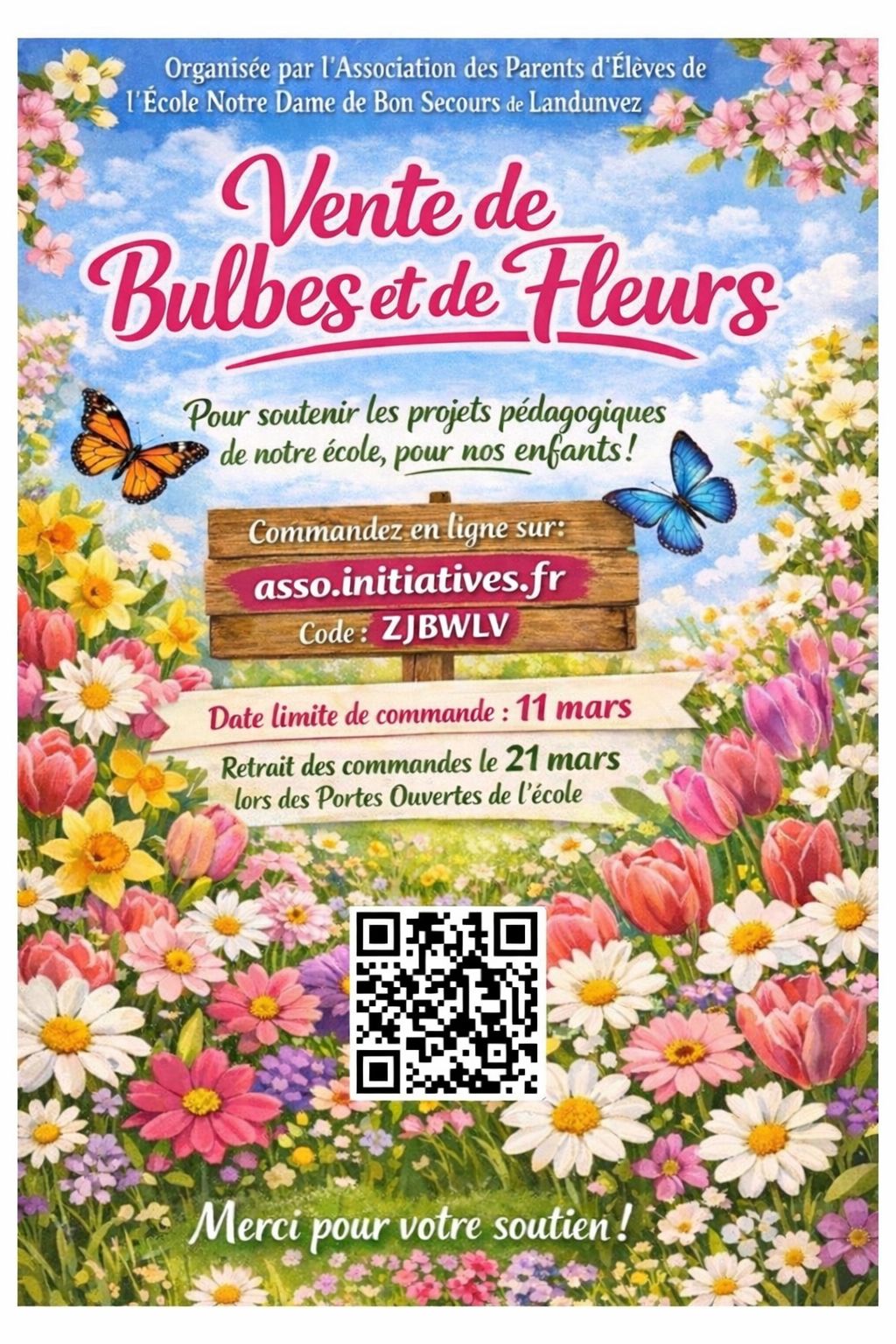 Pour soutenir les projets pédagogiques de l'école Notre Dame de Bon Secours de Landunvez, l'association des parents d'élèves vous propose une vente de bulbes et de fleurs.