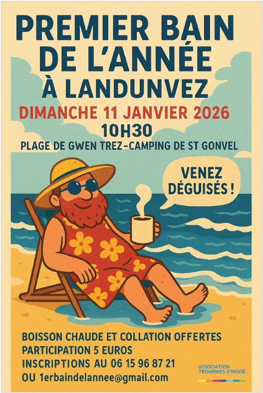 L’association Trombines d’Iroise a le plaisir de vous inviter à la 3ᵉ édition de son événement incontournable : le Premier Bain de l’année à Landunvez ! Rendez-vous est donné le dimanche 11 janvier 2026 à 10h30 sur la plage de Gwen-Trez, face à l’entrée du camping de St Gonvel. Venez démarrer l’année de façon originale et festive ! Prolongez la magie des fêtes en partageant un moment convivial et inoubliable, que vous soyez en combinaison, en maillot de bain, ou même déguisé – l’essentiel étant d’apporter votre sourire et votre bonne humeur. La sécurité des participants sera assurée grâce à la présence d’un médecin, des équipes de la Protection Civile sur la plage, et de la SNSM en mer. Pour rythmer cet événement, nous aurons la joie d’accueillir les sonneurs de Porspoder, “Sonerien An Tevenn”, ambiance festive garantie. Au programme : 10h30 : Accueil et inscriptions, 11h00 : Séance d’échauffement, 11h10 : Le grand bain (15 minutes). Après l’effort, place au réconfort : une boisson chaude et une collation seront offertes à tous les participants. Inscriptions : par e-mail, téléphone ou directement sur place le jour de l’événement. Cet événement est organisé par l’association Trombines d’Iroise, en partenariat avec la commune de Landunvez et le soutien précieux des bénévoles. Nous espérons vous voir nombreux pour démarrer 2026 dans la joie et la convivialité ! Renseignements et inscriptions : par mail 1erbaindelannee@gmail.com ou par téléphone : 06.15.96.87.21.