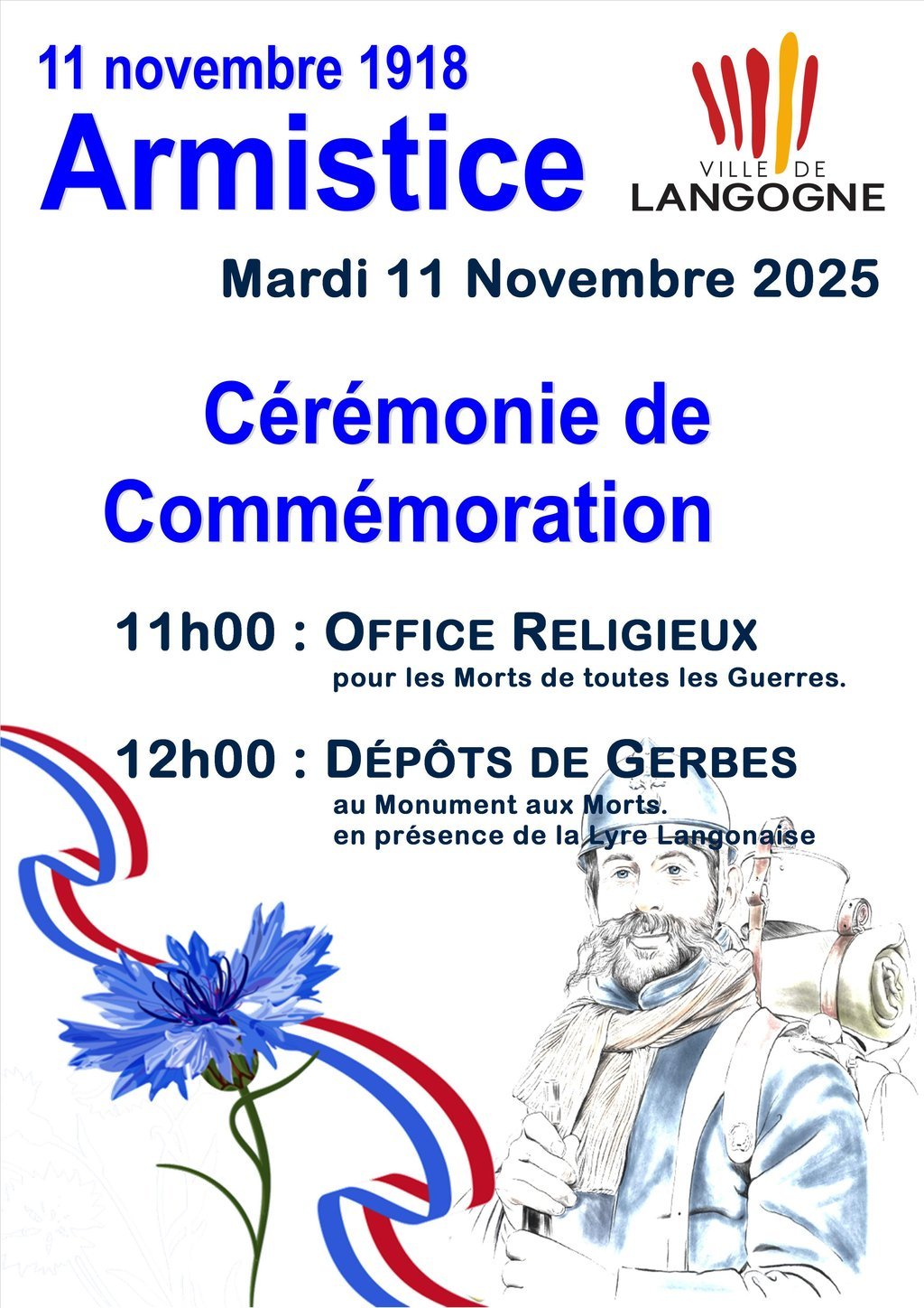 11h Office religieux pour les Morts de toutes les Guerres. 12h dépôts de Gerbes au Monument aux Morts en présence de la Lyre Langonaise.