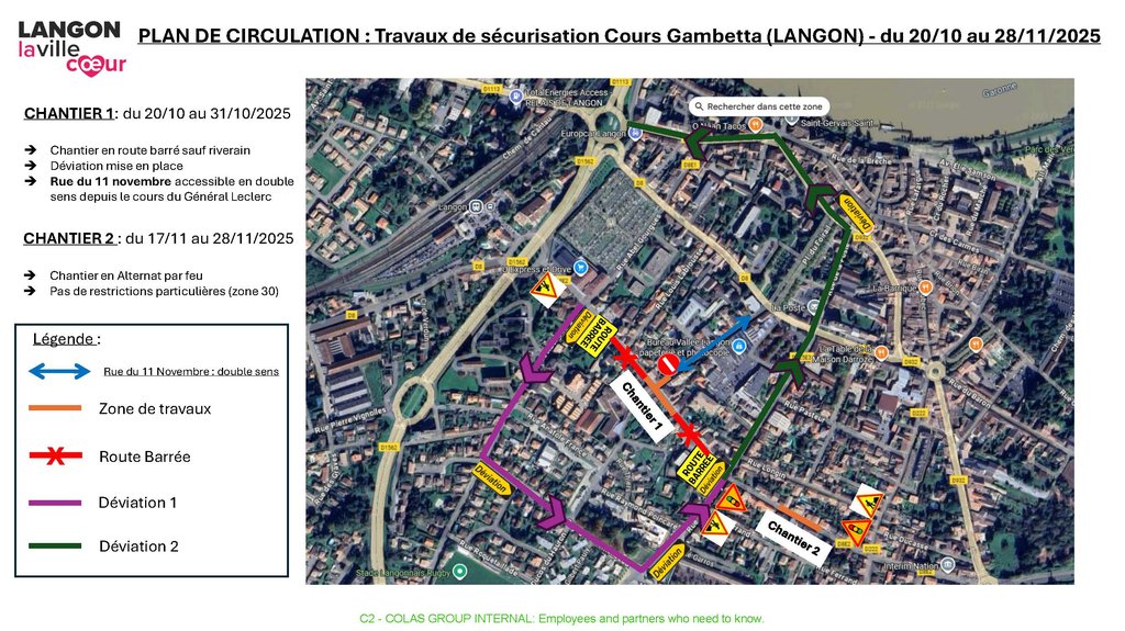 > Le premier chantier (du 20 au 31 octobre), à hauteur de l'école maternelle Anne Frank entraînera une interdiction de circulation sur le cours Gambetta dans sa section entre les carrefours avec la rue Abel Gourgues d'une part et la rue Jules Ferry et la rue des Salières d'autre part avec mise en place de déviations et circulation à double sens de la rue du 11 novembre pour y entrer et en sortir uniquement par le cours du Gal Leclerc.