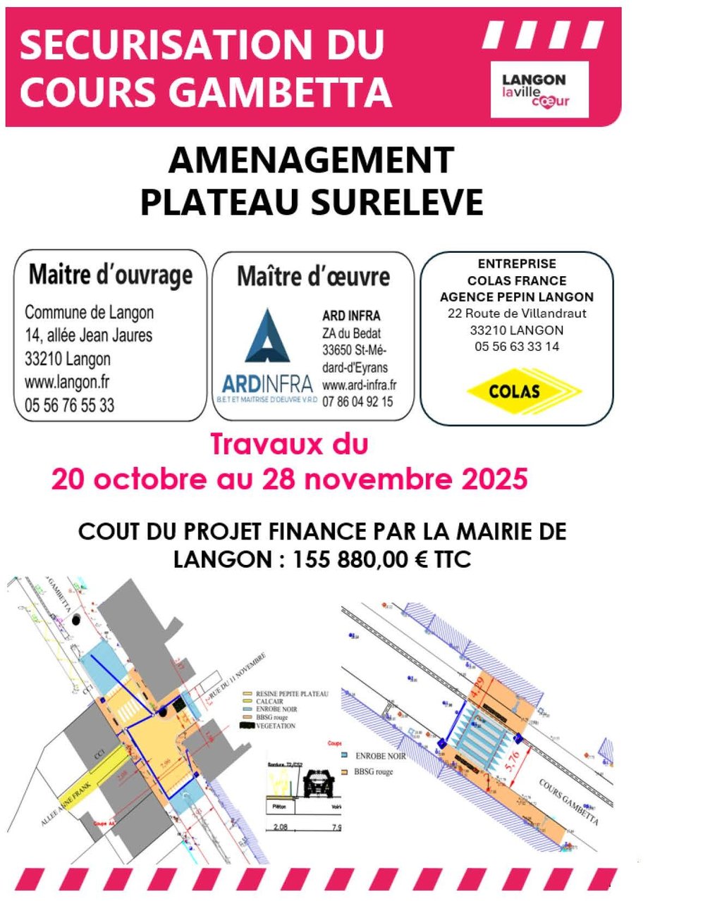 La Ville de Langon engage un important chantier de sécurisation des déplacements cours Gambetta avec l'aménagement de deux plateaux surélevés pour un coût de 155 880 € TTC financé par la Ville.