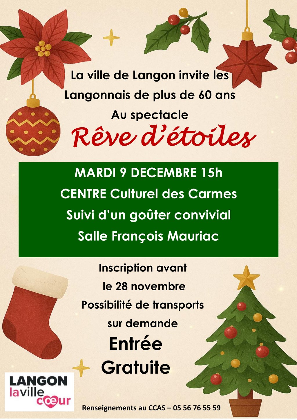 Le CCAS de Langon invite les Langonnais de plus de 60 ans au spectacle « Rêve d’Etoiles » Mardi 9 décembre à 15h au Centre culturel des Carmes. La représentation sera suivie d’un goûter convivial Salle François Mauriac.