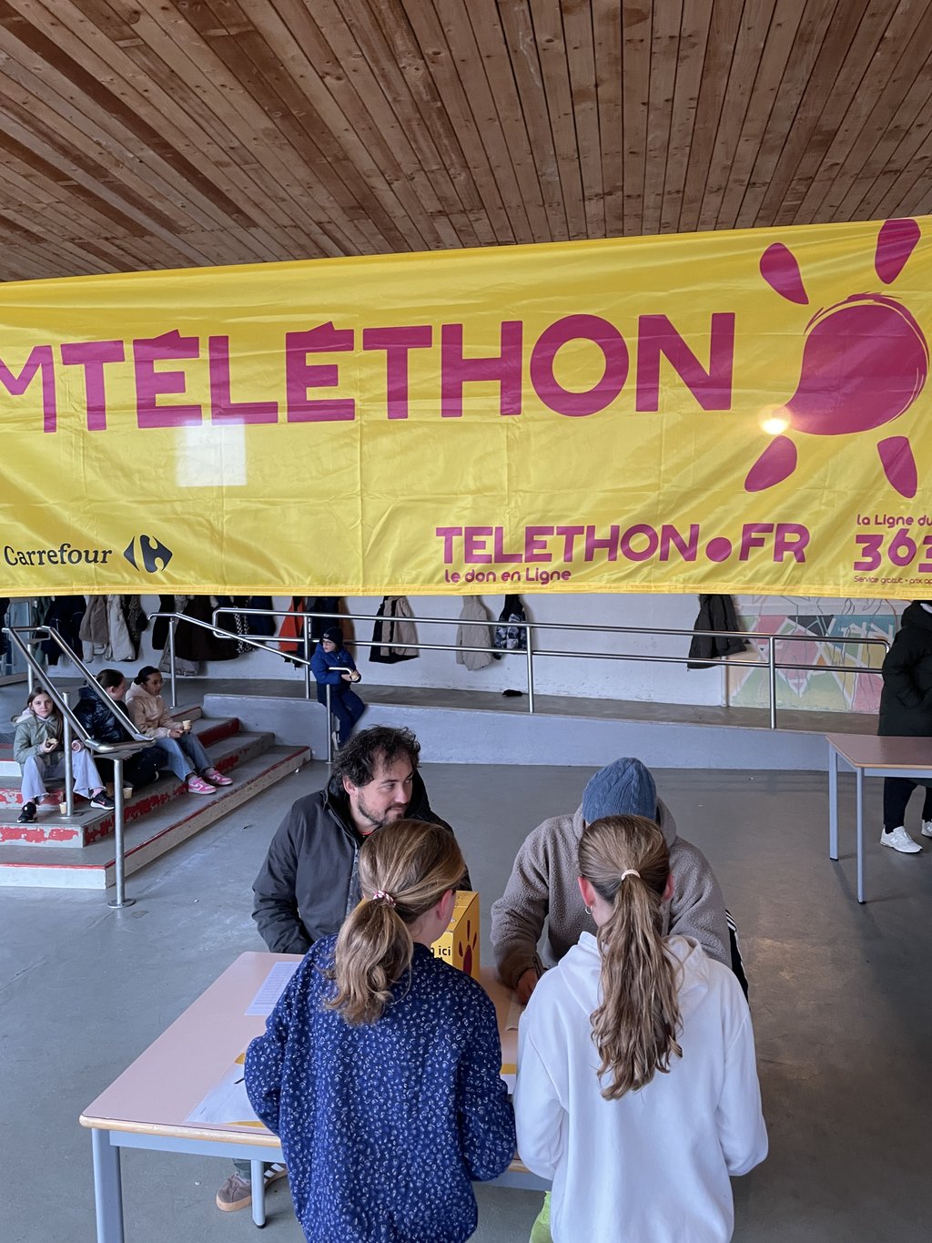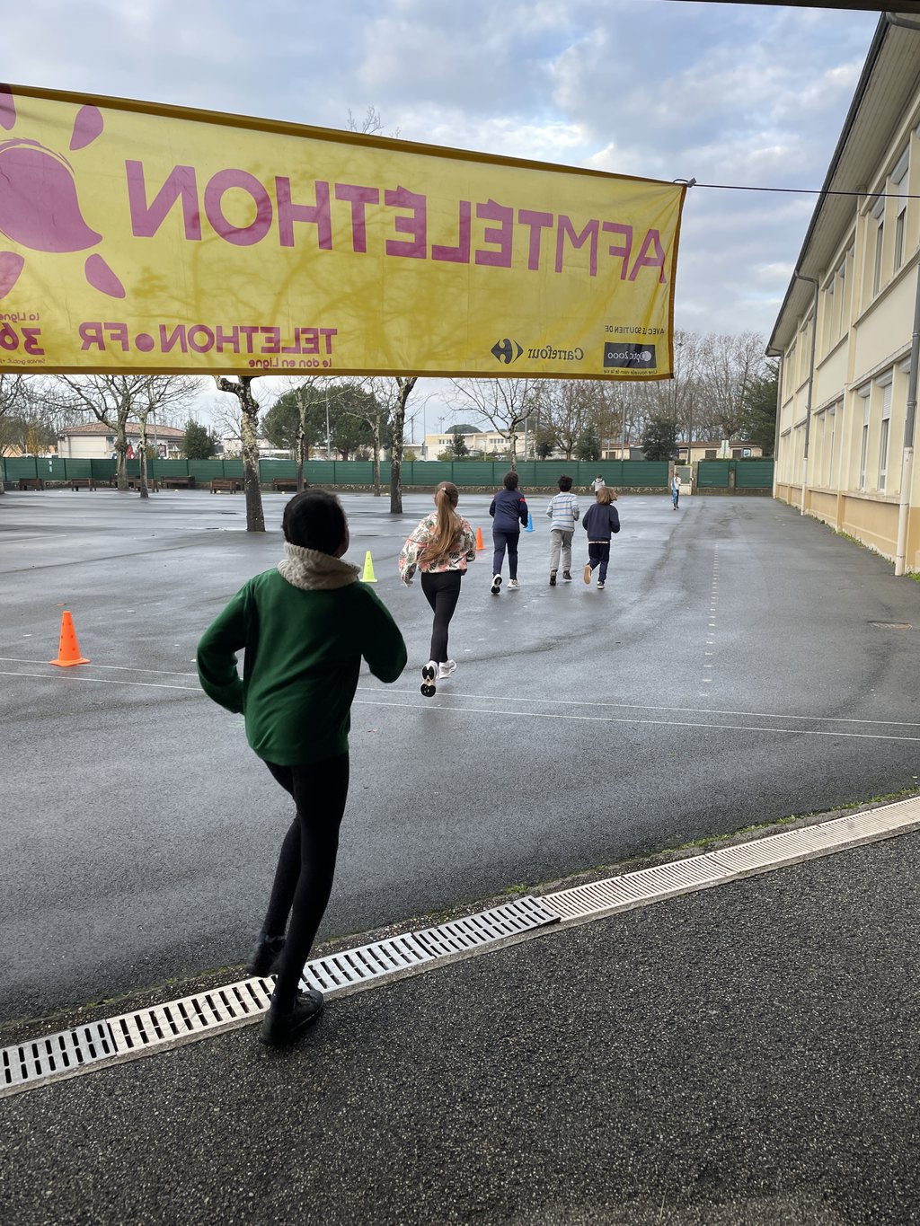 Le Téléthon 2025 est en marche à Langon. Toute la journée, les écoliers de Saint-Exupéry ont couru dans la cour. 1. je cours ; 2. j'annonce combien j'ai fait de tours et 3. je me réconforte avec un goûter servi par les parents d'élèves. Merci à tous.