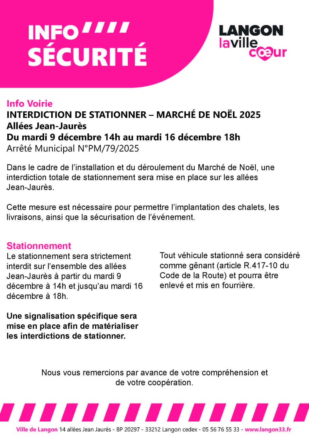 Le centre-ville se prĂ©pare Ă revĂȘtir ses plus beaux habits de fĂȘte ! Ă partir du mardi 9 dĂ©cembre Ă 14h, et jusquâau mardi 16 dĂ©cembre Ă 18h, le stationnement sera interdit sur les allĂ©es Jean-JaurĂšs, afin de permettre la bonne installation et la sĂ©curitĂ© du MarchĂ© de NoĂ«l.