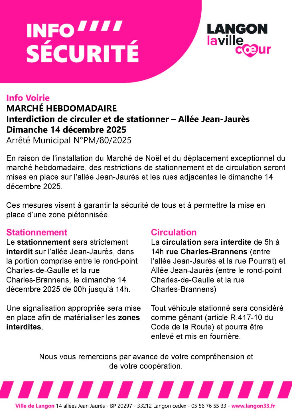En raison de l’installation du Marché de Noël et du déplacement exceptionnel du marché hebdomadaire, des restrictions de stationnement et de circulation seront mises en place sur l’allée Jean-Jaurès et les rues adjacentes le dimanche 14 décembre 2025.