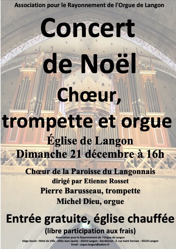 L'association pour le rayonnement de l'orgue de Langon organise un concert de Noël Chœur (de la Paroisse du Langonnais, dirigé par Etienne Rosset), orgue (Michel Dieu) et trompette (Pierre Barusseau) le dimanche 21 décembre à 16h à l'église (chauffée 😉) de Langon.