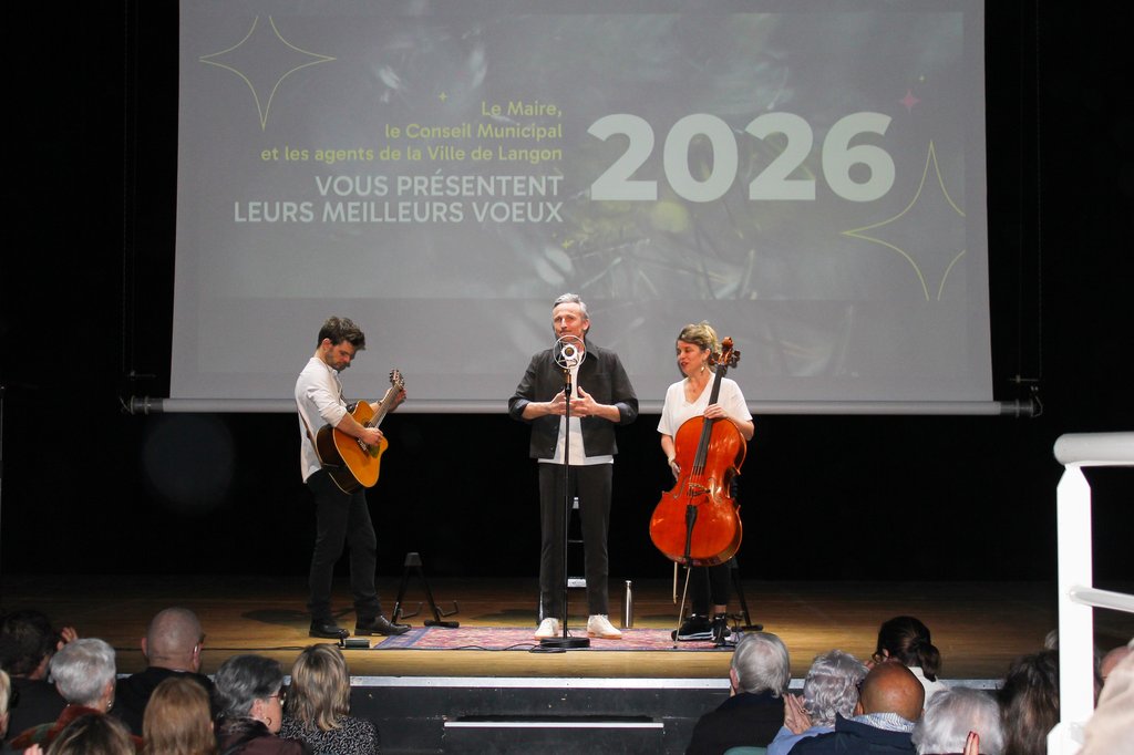 Mercredi 21 janvier, un public très nombreux était présent au Centre culturel des Carmes pour la Cérémonie des vœux 2026 qui a débuté en musique avec MAKJA et ses musiciens. Puis le Maire de Langon, Jérôme Guillem a prononcé un discours disponible ici.