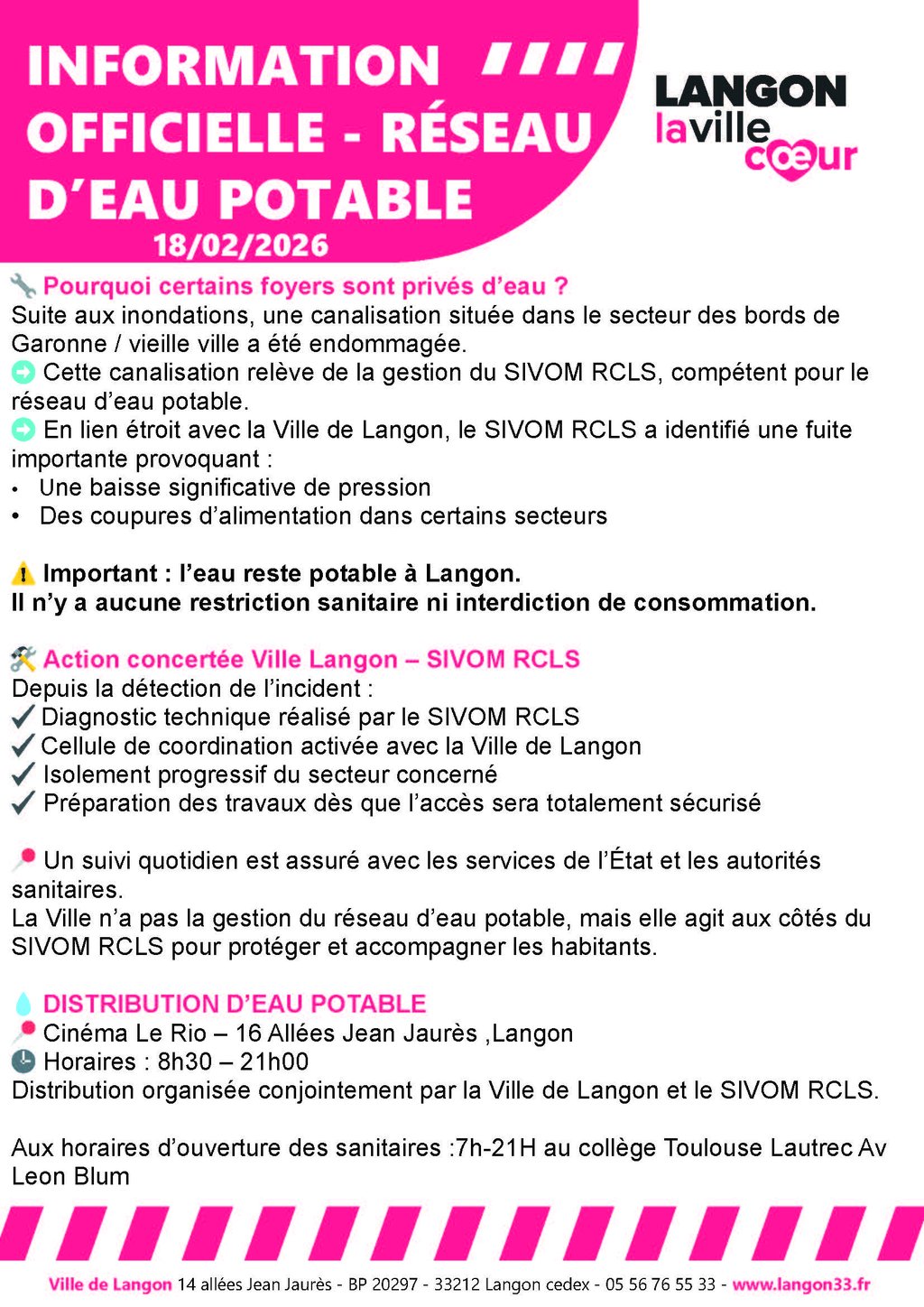 ✔️ Le SIVOM RCLS poursuit les investigations techniques : afin de faciliter les recherches, le SIVOM RCLS pourra être amené à effectuer des micro-coupures temporaires sur le réseau