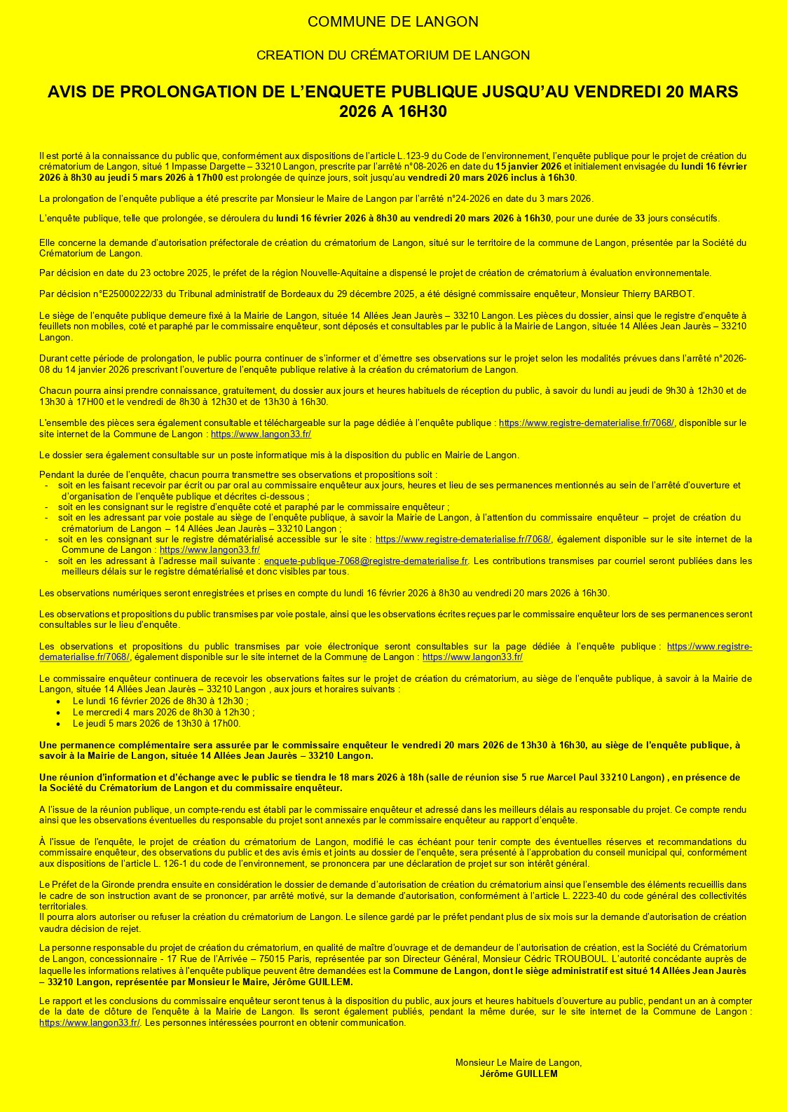 Il est porté à la connaissance du public que, conformément aux dispositions de l’article L.123-9 du Code de l’environnement, l’enquête publique pour le projet de création du crématorium de Langon, situé 1 Impasse Dargette – 33210 Langon, prescrite par l’arrêté n°08-2026 en date du 15 janvier 2026 et initialement envisagée du lundi 16 février 2026 à 8h30 au jeudi 5 mars 2026 à 17h00 est prolongée de quinze jours, soit jusqu’au vendredi 20 mars 2026 inclus à 16h30.