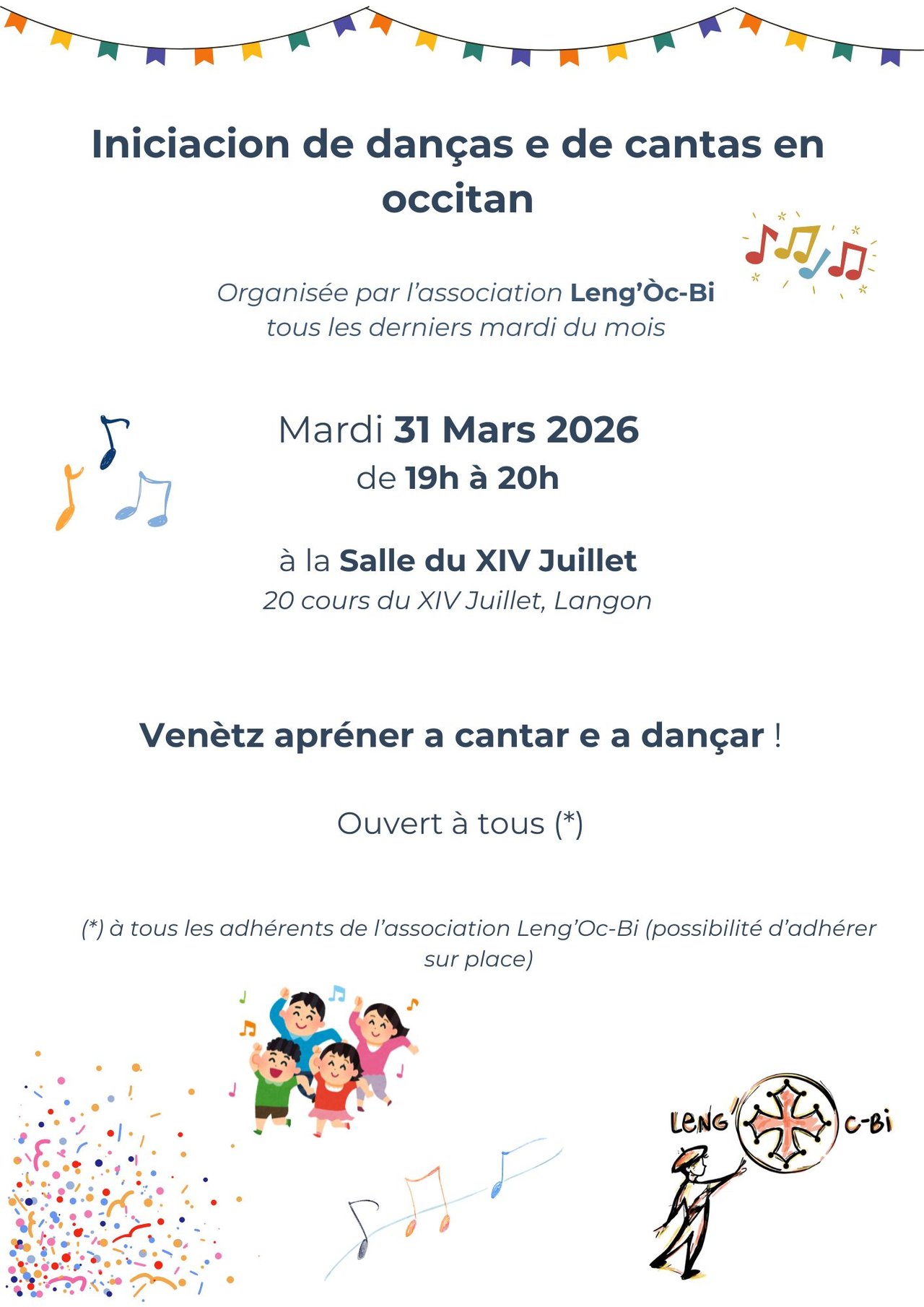 Venez apprendre à chanter et danser en occitan. Prochain cours le 31 mars. Gratuit après adhésion à l'association (5 €) comme tous les derniers mardis du mois jusqu'au 26 mai.