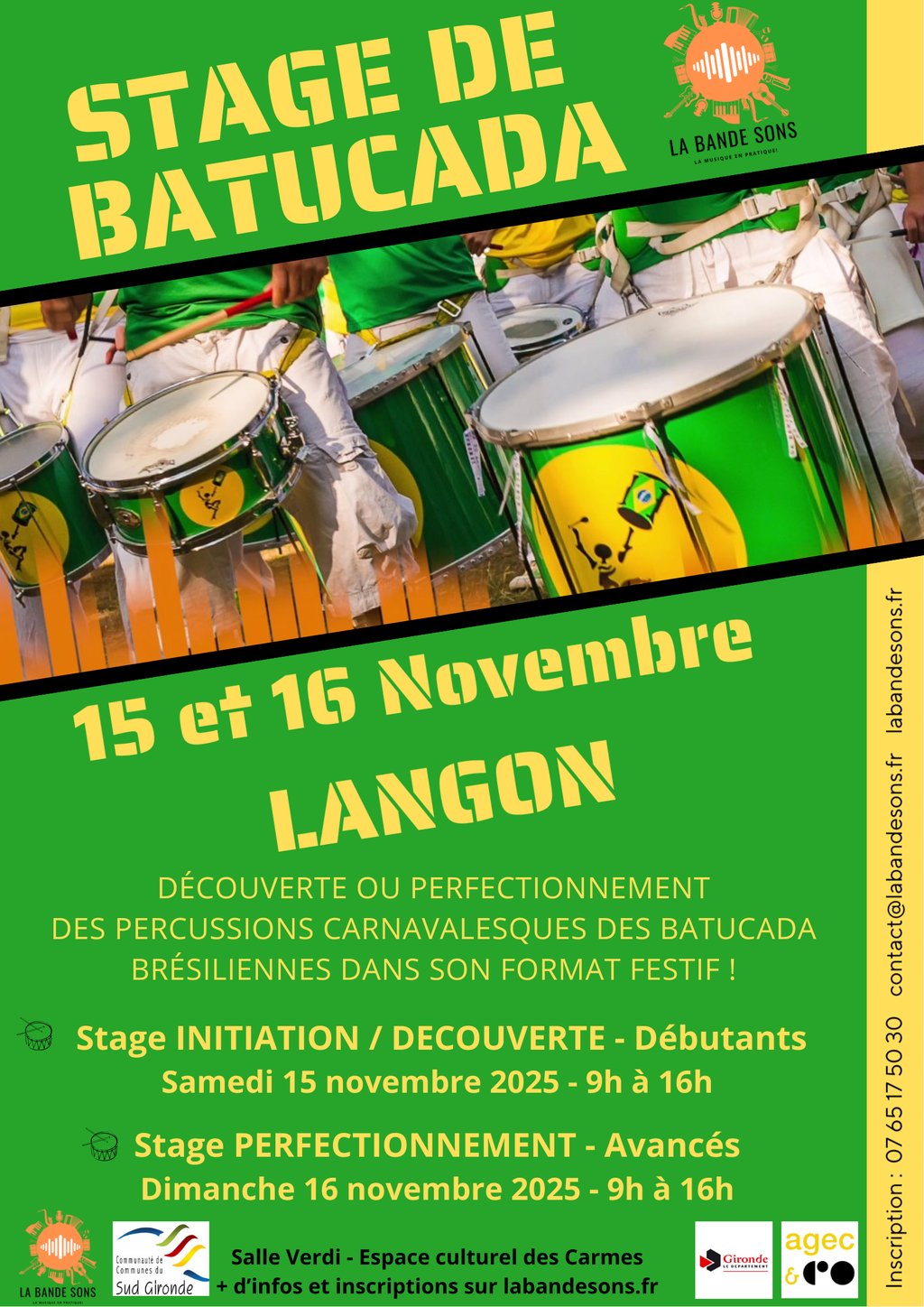 - Initiation ou perfectionnement aux percussions de Batucada (Surdos, Caixa, Timba, Répique…)