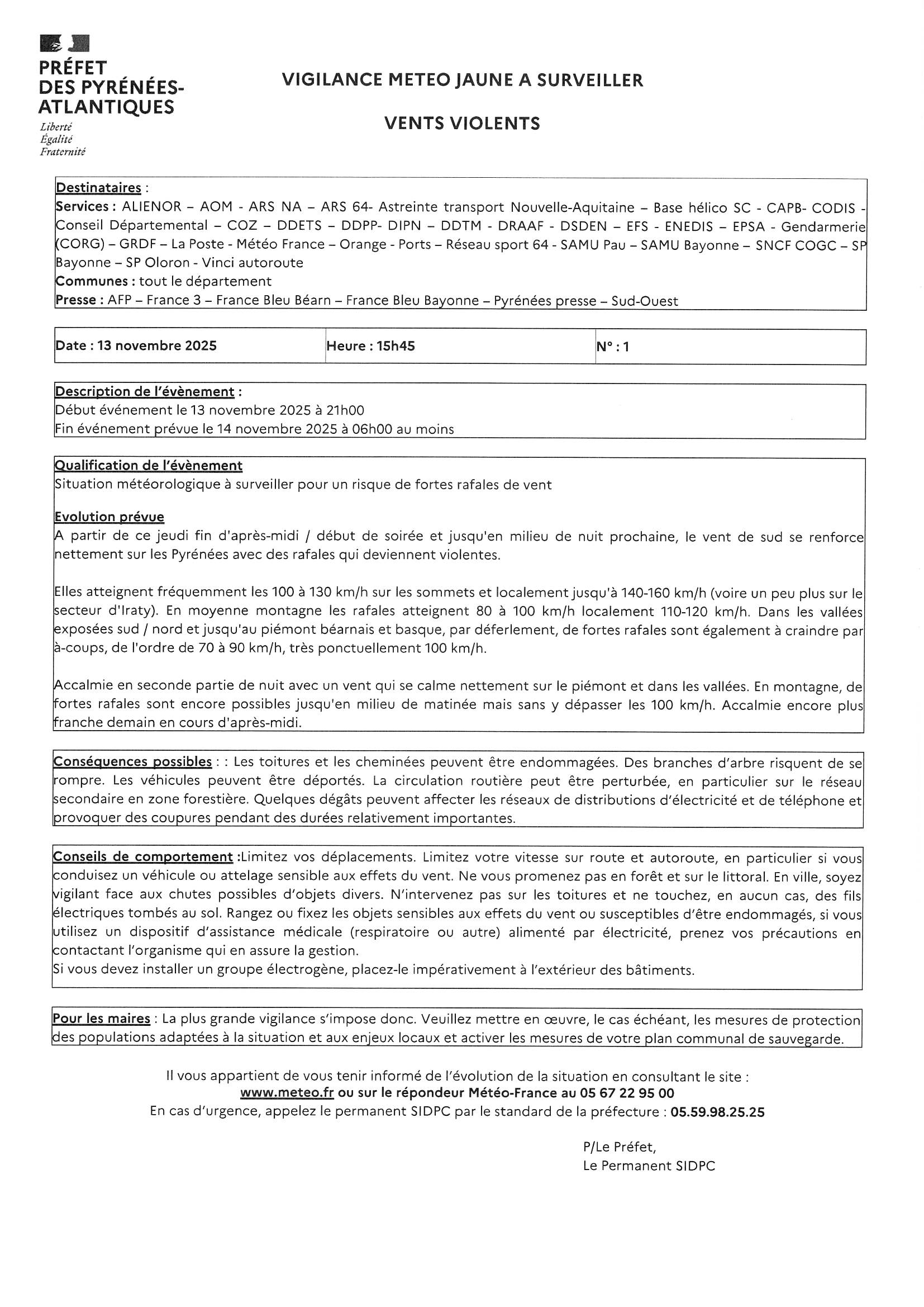 VIGILANCE METEO JAUNE POUR VENTS VIOLENTS (cf. alerte préfecture ci-jointe)