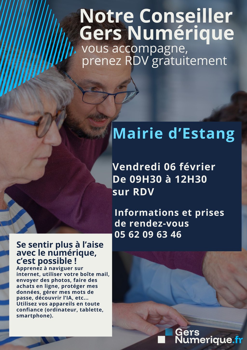 📍 Le conseiller Gers Numérique se déplace au plus près de chez vous pour vous accompagner gratuitement et individuellement sous forme d'atelier.