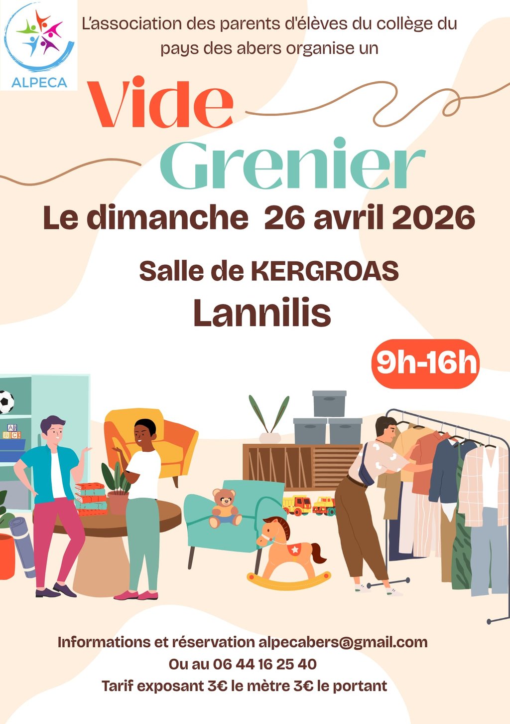 L'Amicale Laïque des Parents d'Elèves du Collège des Abers (ALPECA) organise un vide-grenier le 26 avril salle de Kergroas.