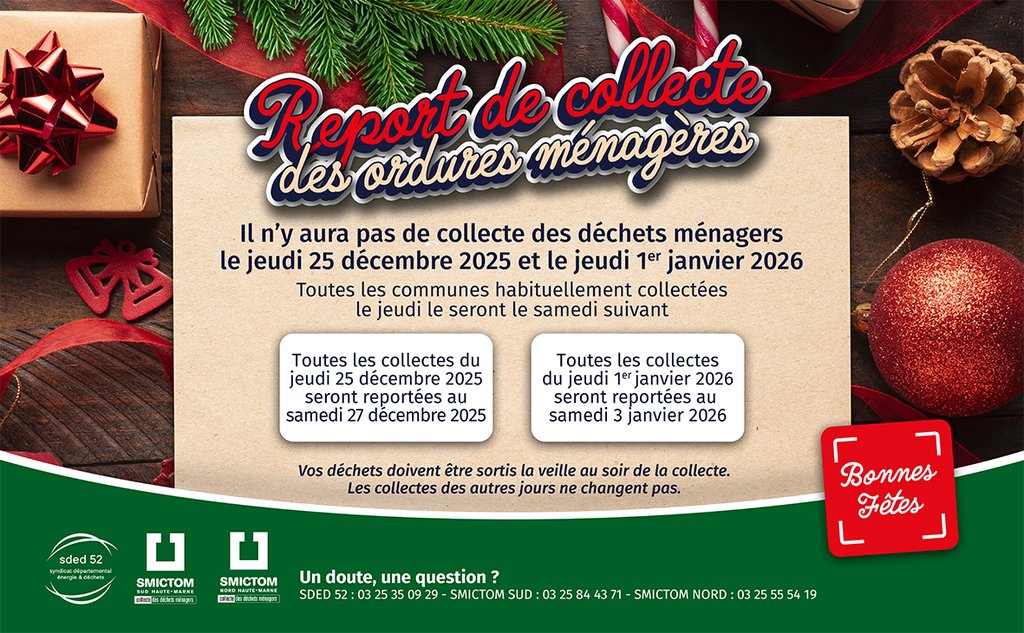 En raison des fêtes de fin d'année, la collecte des déchets ménagers est reportée (cf document joint).