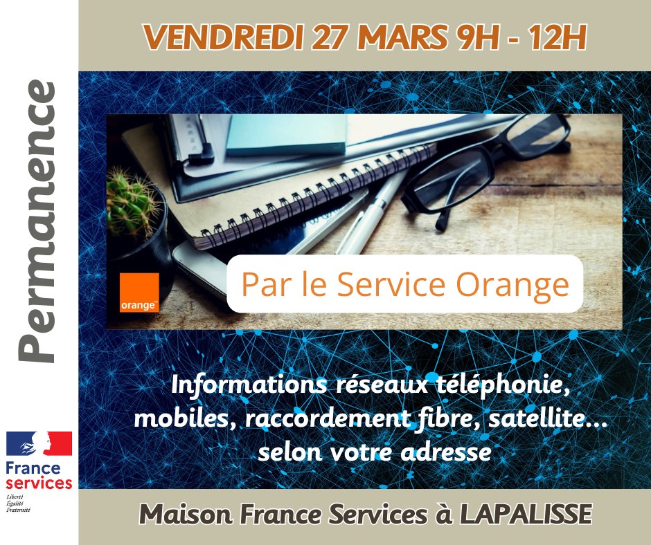 La prochaine permanence mensuelle Orange se tiendra le vendredi 27 mars de 9h à 12h à la Maison France Services.