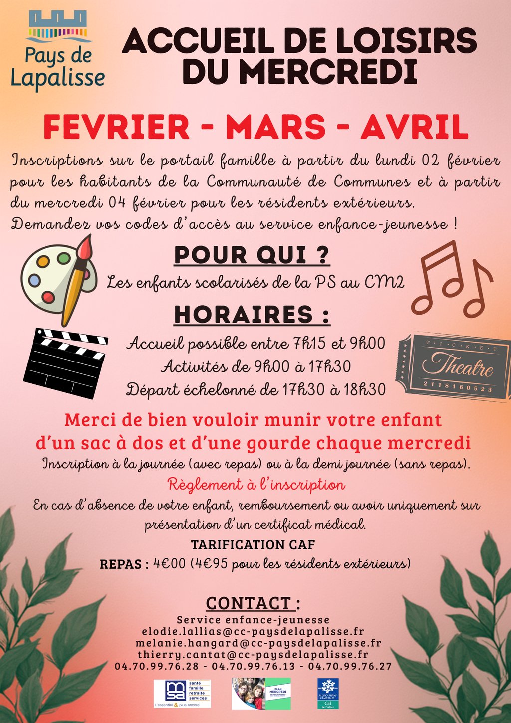 Inscription aux Mercredis Récré, UNIQUEMENT via le portail famille. Vous n'avez pas vos identifiants ? C'est le moment de contacter le service enfance-jeunesse au 04.70.99.76.28 ou par mail : elodie.lallias@cc-paysdelapalisse.fr,