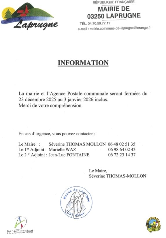 FERMETURE DE LA MAIRIE ET DE L'AGENCE...