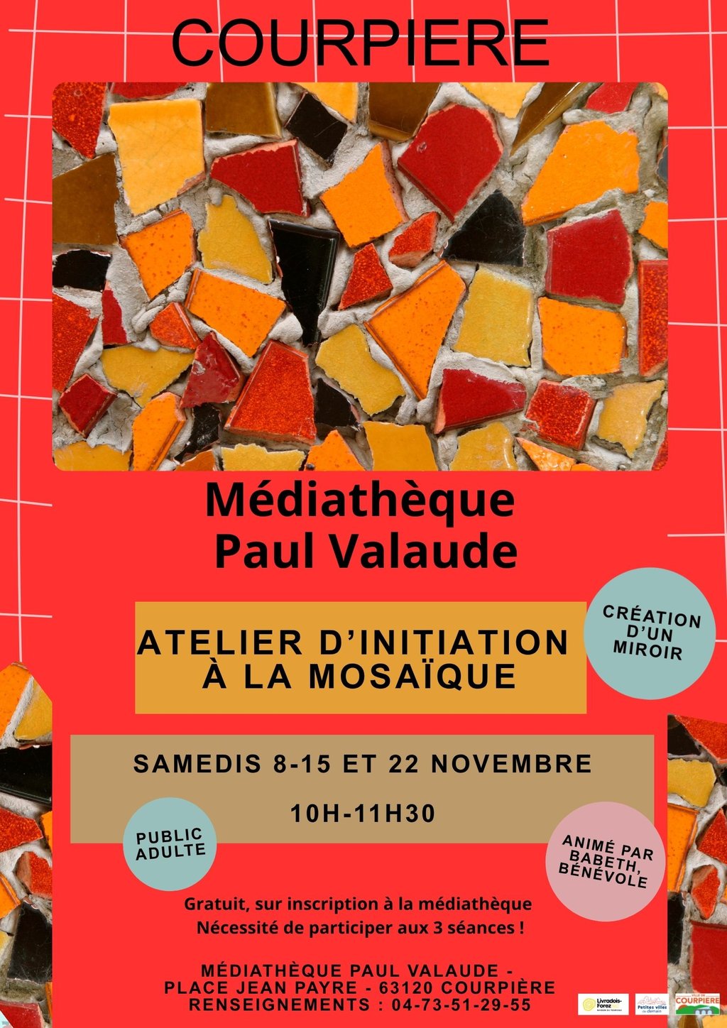 La médiathèque Paul Valaude organise un atelier initiation à la mosaïque les samedis 8, 15 et 22 novembre 2025 à 10h00 (public adulte)