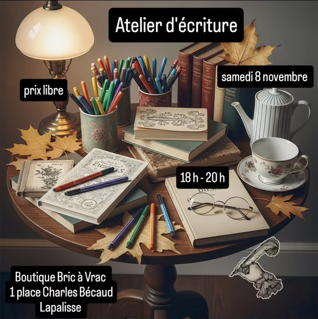 Atelier d'écriture, samedi 8 novembre de 18 à 20 heures, chez Bric à Vrac, 1 place Charles Bécaud à Lapalisse.