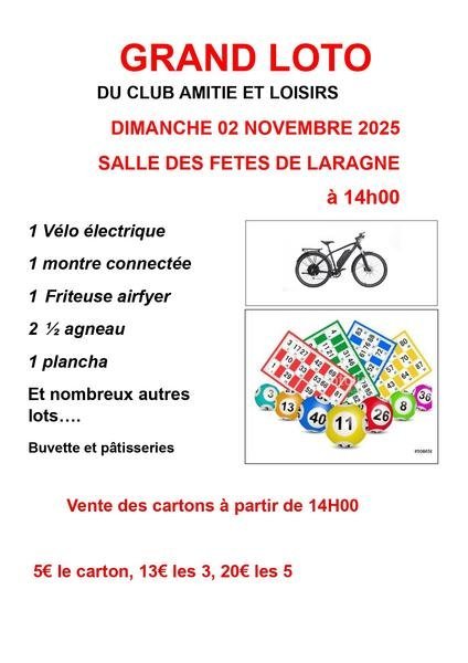 Loto ouvert à tous avec de nombreux lots à gagner dont 1 vélo électrique, 1 montre connectée, 1 friteuse airfyer, 1 plancha, 1/2 agneau, ...