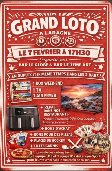 Un loto en duplex dans les 2 bars, avec de nombreux lots à gagner : 1 box week-end, 1 TV, 1 Air Fryer, des repas dans nos restaurants, des bons d'achats, bons pour des pizzas, places de hockey, filets garnis,...